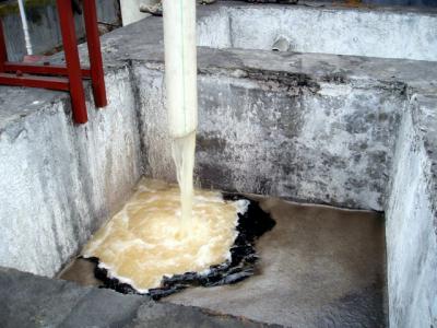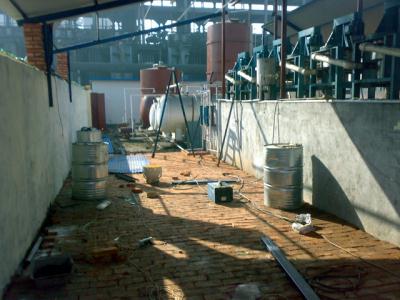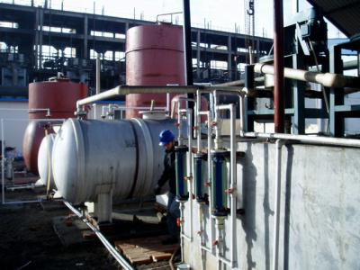 山东魏桥集团铝电有限公司 山东XX集团是全球最大的印染企业,其下属的铝电公司年产1000万吨氧化铝。其一期煤气站拥有32台两段式煤气发生炉。设计使用CF230离心萃取器8台,处理量为每天150吨。 安装现场 运行现场 处理前进水口 处理后出水口 水面上黑色物质为待回收的少量夹带溶剂。